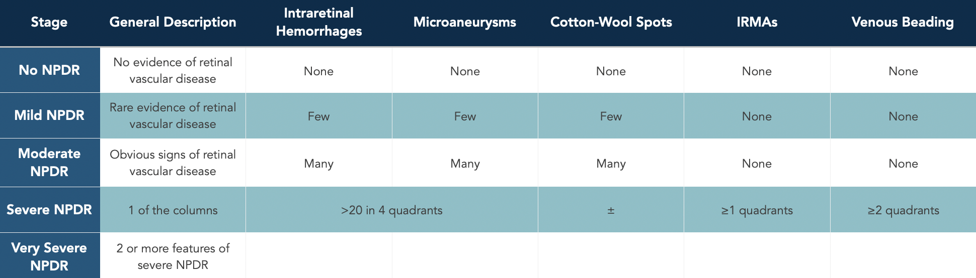 The Early Treatment of Diabetic Retinopathy Study (ETDRS) defined the stages of NPDR. Severe NPDR (15%) and very severe NPDR (45%) were found to have a high risk for developing high-risk proliferative diabetic retinopathy (defined below) within a year.