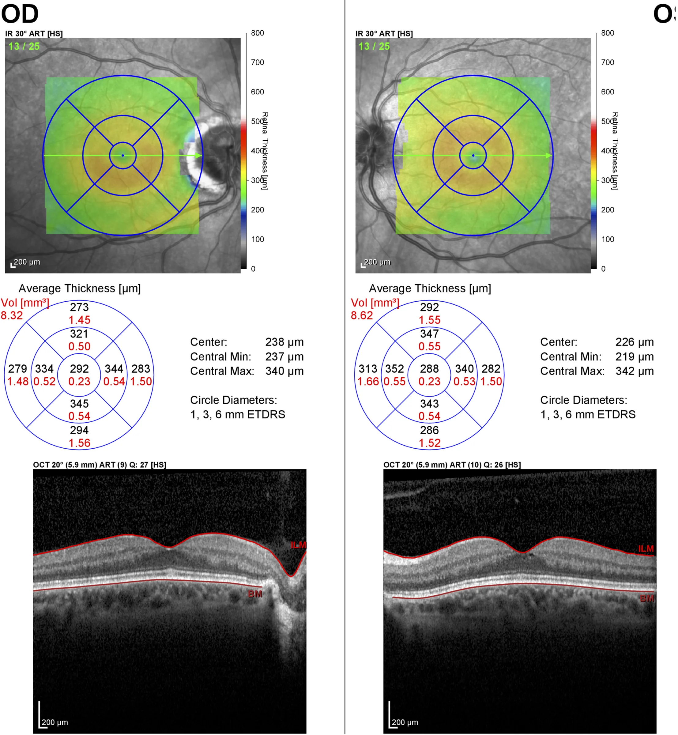 Optical coherence tomography of the macula demonstrating an essentially normal fovea in each eye. This patient presented with optic atrophy, but with a history of optic nerve edema noted by an outside ophthalmologist. Because a branch retinal artery occlusion can also result in similar visual field defects and sectoral optic atrophy, an OCT of the macula helped confirm the preservation of the inner retina, which supports the diagnosis of NAION.